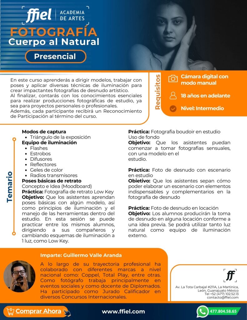 ¡Aprende a capturar imágenes impactantes y artísticas de cuerpo al natural! Este curso es ideal para perfeccionar tu técnica en el manejo de luz y composición con modelos.